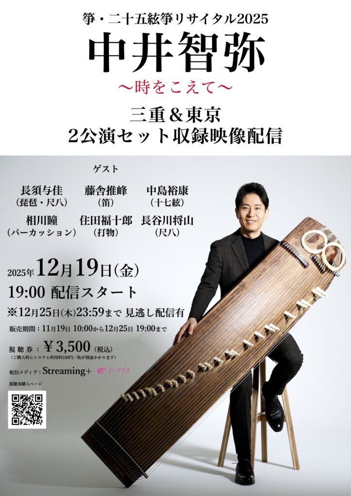 9月27日(三重)と10月12日(東京)に開催された「中井智弥 箏・二十五絃箏リサイタル2025〜時をこえて〜」の公演が映像配信となって戻って来ました!当日にご都合が合わずご来場いただけなかった方、遠方のため来られなかった方、もう一度コンサートを楽しみたい方もご自宅でご覧いただけます。2公演セットですのでどちらも観れて楽しさ2倍!1週間のアーカイブ期間付きなので、配信当日に見られなくても安心、期間中何度でもご覧いただけます。出演者の表情や手元までクリアな映像と音質で公演をたっぷり楽める!!是非お申し込みください。