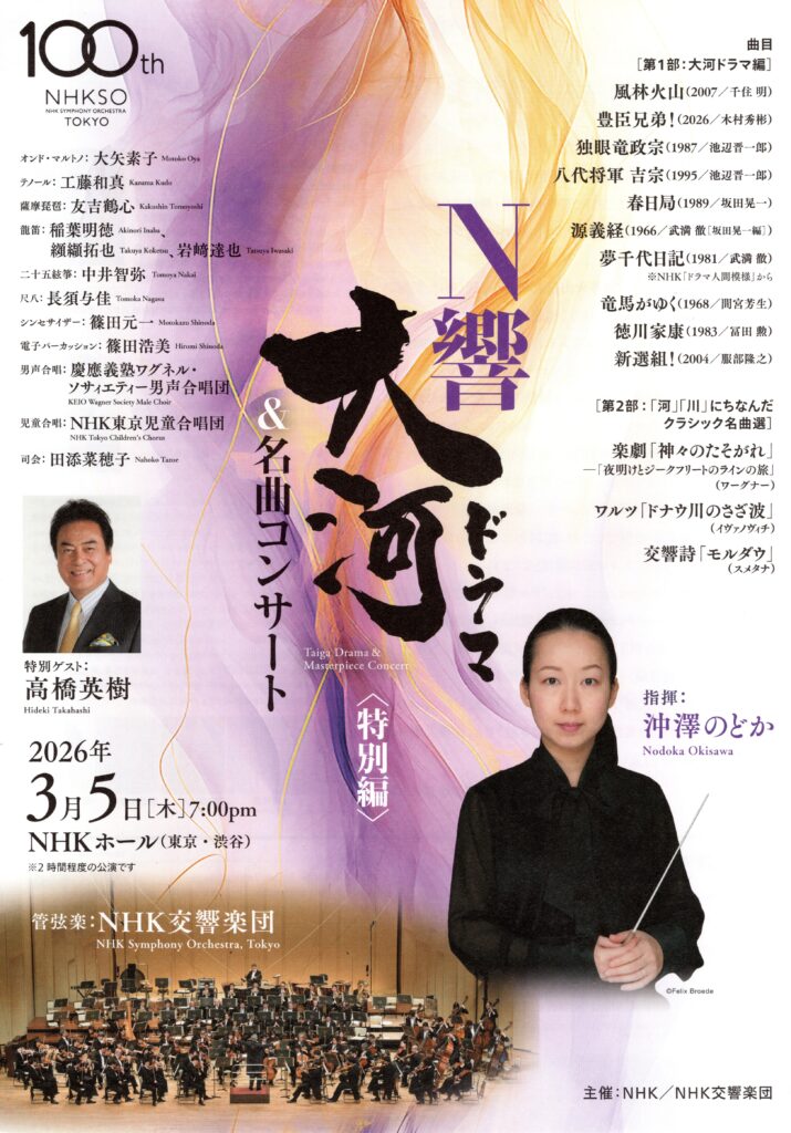 幻の作品の復活演奏と豪華コラボで贈る特別な一夜。大河ドラマの放送開始以来、ほとんど全てのテーマ音楽を演奏してきた“本家本元”NHK交響楽団による、年に1度のコンサート。3回目となる2026年は、注目の若手指揮者・沖澤のどかを迎え、和楽器や合唱とのコラボを含む、ひときわ華やかなラインナップでお贈りします。こちらのコンサートに二十五絃箏の演奏で出演いたします!ぜひご来場ください。