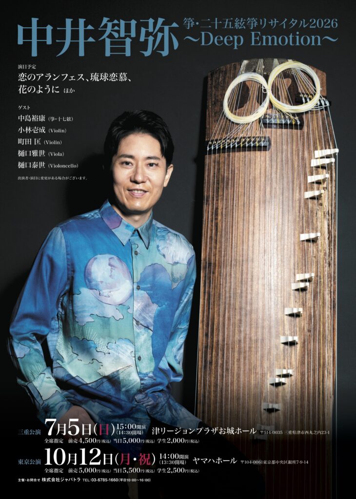 箏・二十五絃箏を駆使し、情景を鮮やかに描き出す中井智弥の音世界。今年で三重リサイタルは28回目を迎えます。中井智弥作曲のオリジナル曲を中心に、箏・十七絃・弦楽四重奏とのアンサンブルで深みのあるステージをお届けします。和楽器による珠玉のステージをどうぞご期待ください!