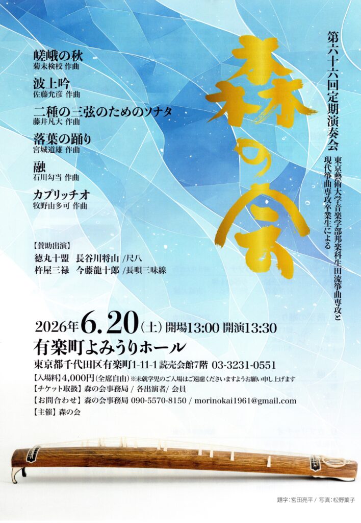 6月20日開催の「森の会」定期演奏会に箏独奏として出演いたします。東京藝術大学邦楽科卒業生による公演で、牧野由多可作曲「カプリッチオ」に挑みます。大合奏の中でのソロという緊張感のある役どころですが、仲間とともに作品を一から作り上げています。聴き応えたっぷりの舞台、ぜひお楽しみください!